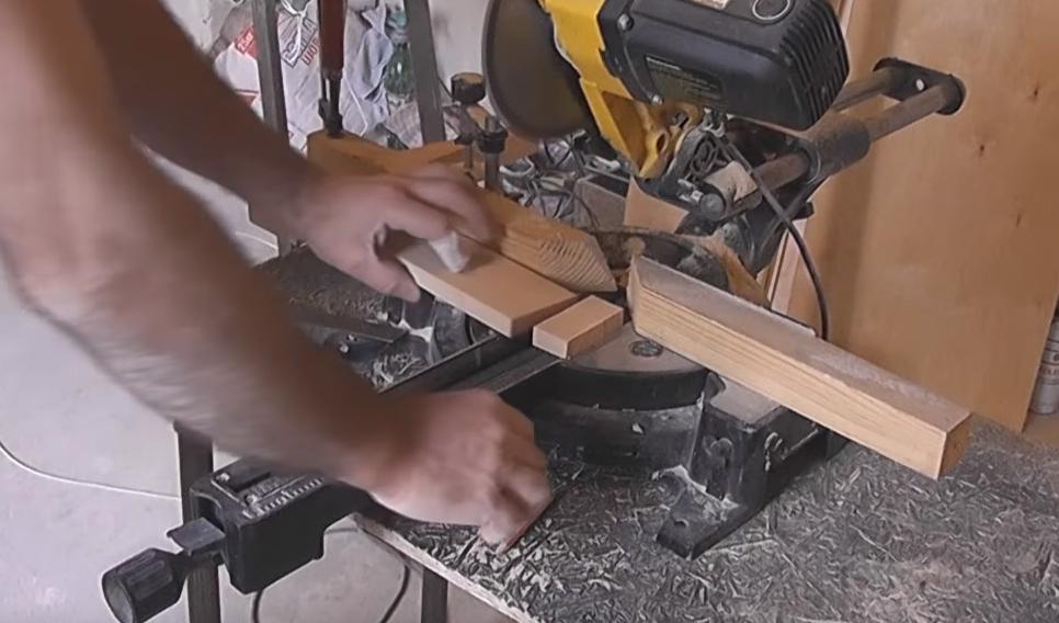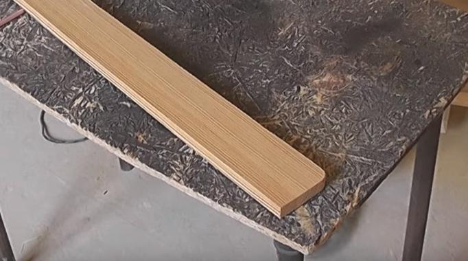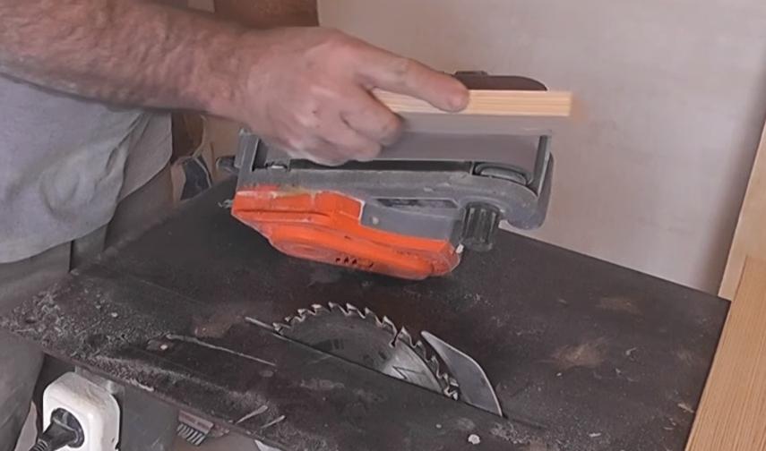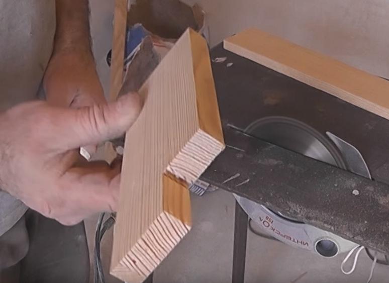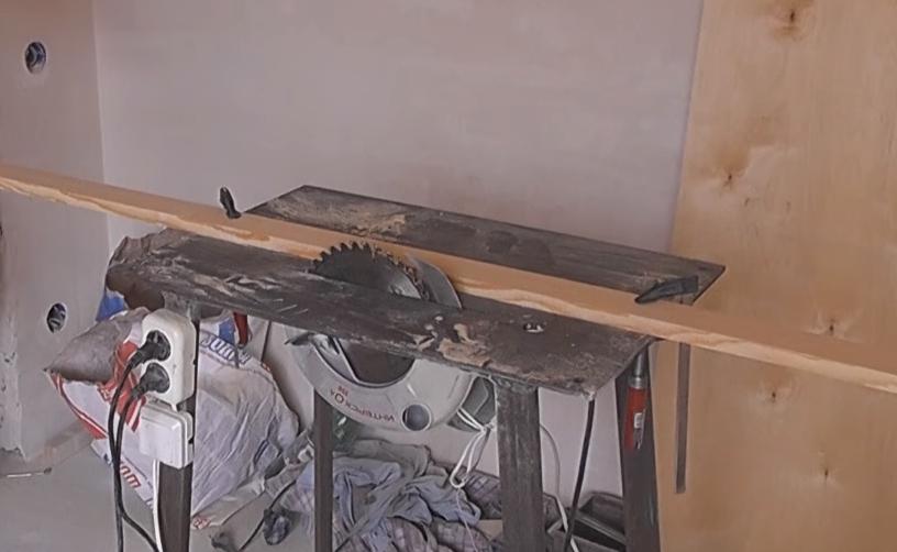 Чтобы сделать это ровно, используем станок с циркулярной пилой и прикрепленную к нему струбцинами доску в качестве направляющей.