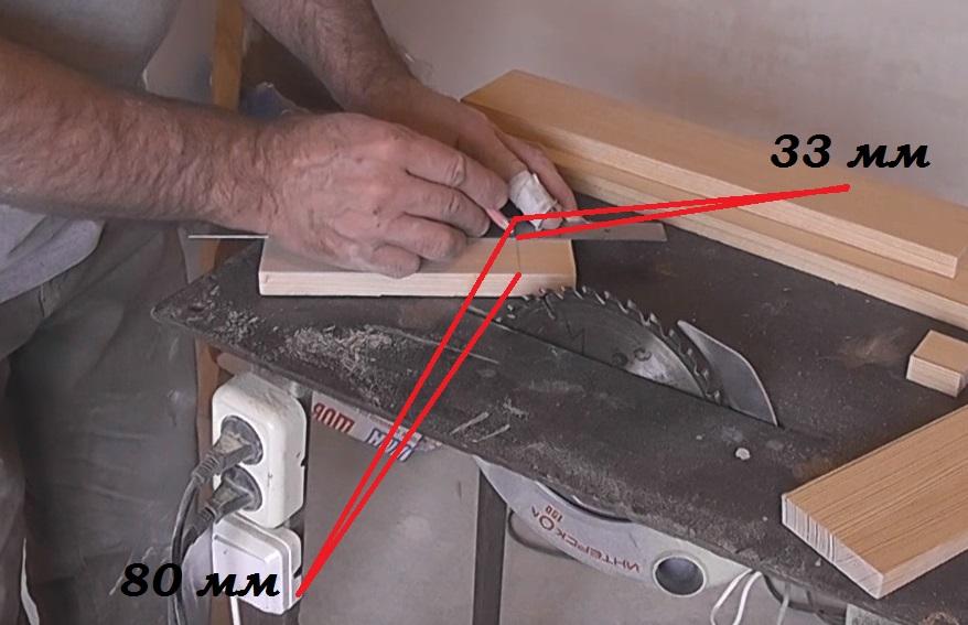 Продолжаем вырезать боковую часть облицовочной планки. Ее ширина составляет 80 мм, откладываем на ней 33 мм - вырез под выступ ступени.