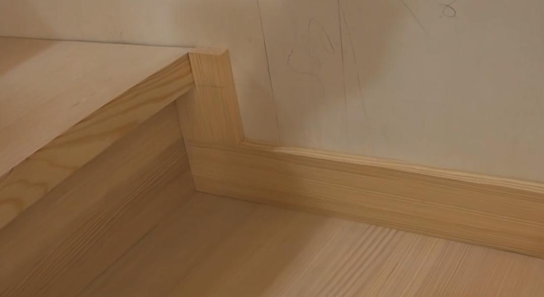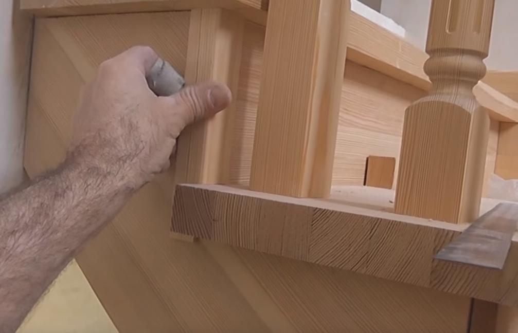 Т.е. угол обрабатывается вдоль всей вертикальной планки, по боковому краю горизонтальной планки и дальше до того места, откуда начинается планка вдоль следующего подступенника и ступени.