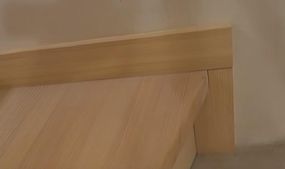 Начинаем с самой нижней подступенной доски. Ставим доску-заготовку под облицовочную планку рядом со ступенью.