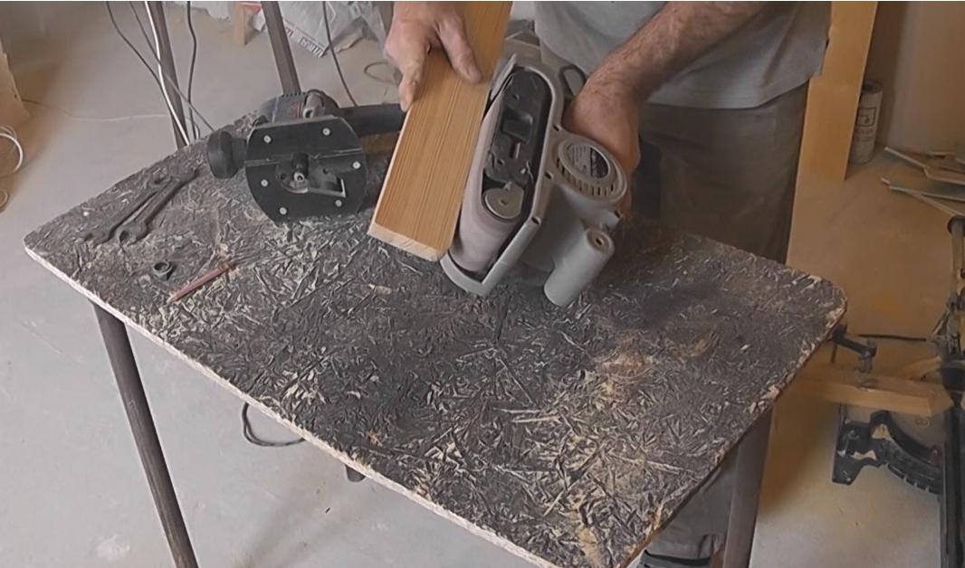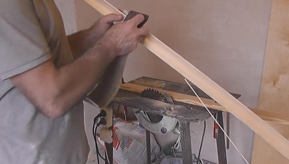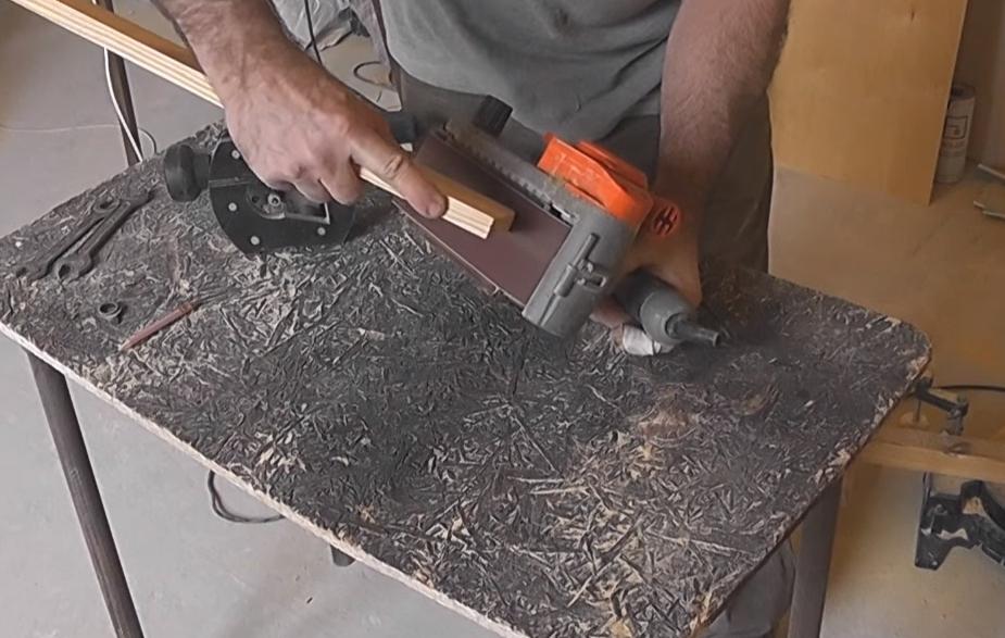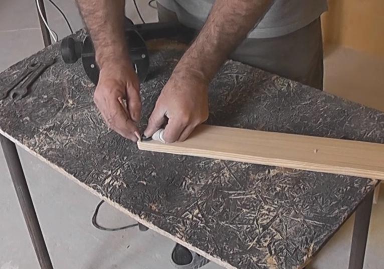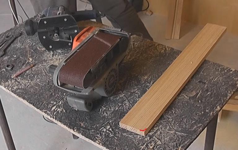Закруглить угол планки по сделанному контуру можно при помощи шлифовальной машинки и наждачной бумаги с зерном 60-80.