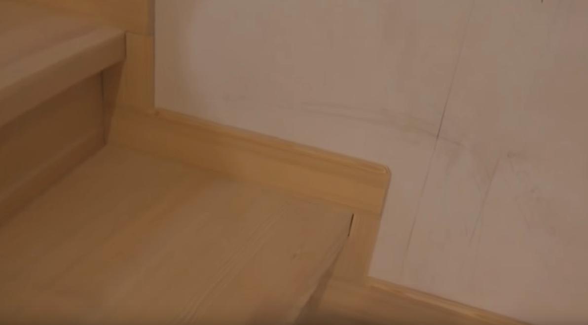 Начинаем облицовывать установленную на металлический каркас деревянную лестницу пристенной планкой.