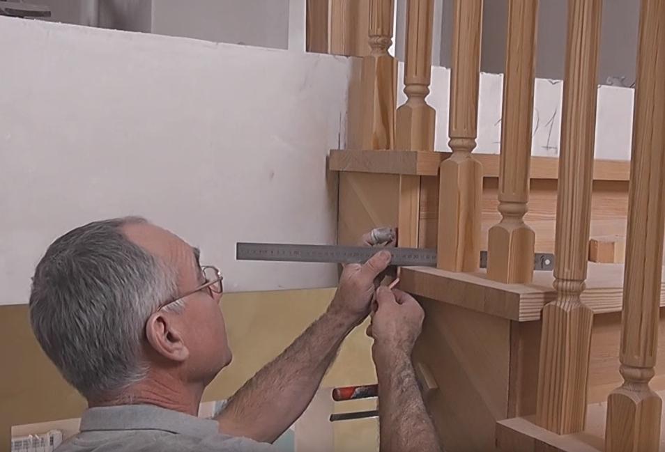 На каждой горизонтальной планке, которая идет поверх ступени, делаем отметку, где начинается вертикальная часть планки.