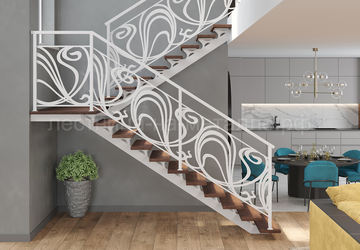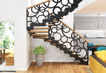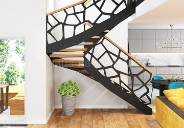 Открытая лестница с дизайнерскими ограждениями. Такой красивый рисунок мы сделали на лазерном станке, а можем делать любые другие рисунки, которые нравятся вам.