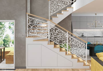 Более экономичный вариант металлические ограждения из трубы или с коваными элементами. Такие ограждения с обшитой деревом лестницей создают гармоничный дуэт. Также мы можем обустроить и пространство под лестницей.