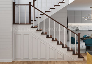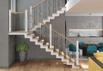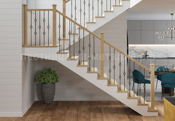 Лестница закрытого типа. Каркас лестницы с площадкой из листа металла 6 мм. 18 ступеней, столбы и поручень из "Дуба-кантри". Ограждения 5 п/м. из деревянных столбов и кованых балясин. Фальшкосоур и подступенники из МДФ, покраска под эмаль.
