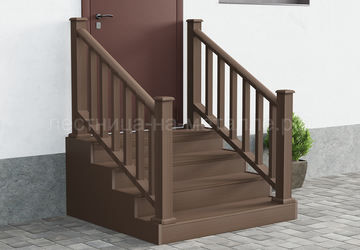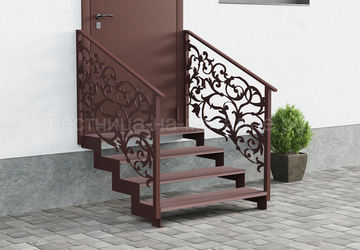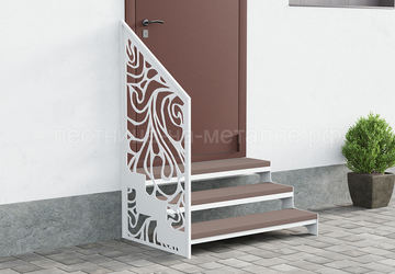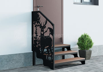 Лестница на ломаном косоуре с ограждением "Флора" и с опорными ногами, покраска Hammerite в черный, белый, серый, коричневый цвет на выбор, ступени ДПК.