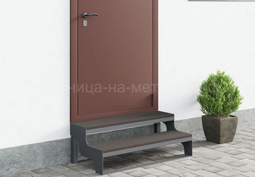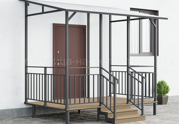 Открытая лестница на ломаном косоуре, подступенник и терраса из ДПК, ограждения металлические вертикальные рейки, опорные ноги, навес - поликарбанат, покраска в любой цвет краской Hammerite.