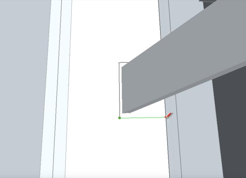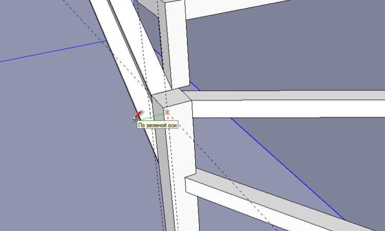 Находим точку пересечения вспомогательных линий и вдоль зеленого горизонтального вектора (следим, чтобы линия, которую мы ведем была окрашена в зеленый цвет) ведем линию на 20 мм от поверхности опорного столба.