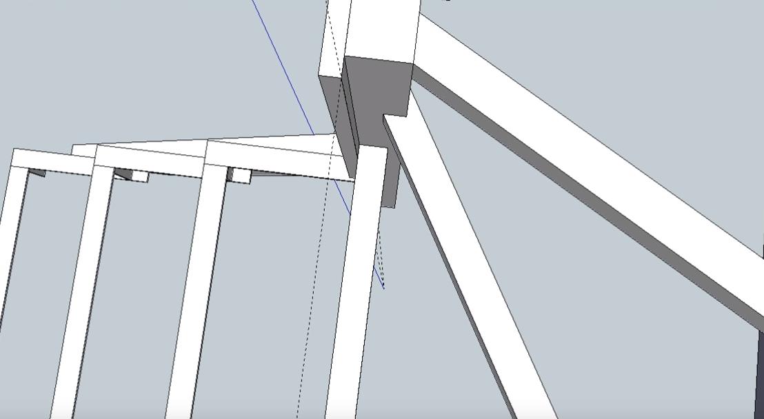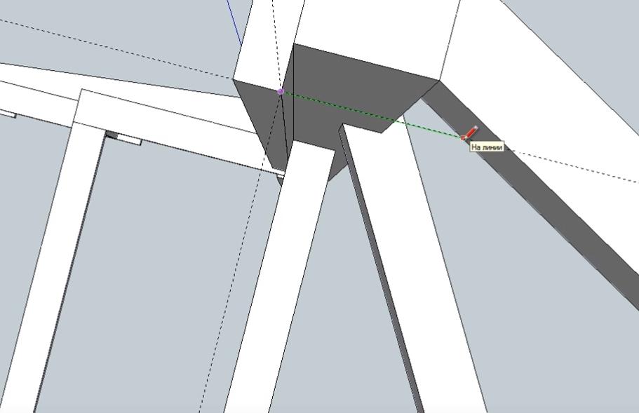 Проверяем место соединения нижнего уголка с опорным столбом и видим, что линия попала точно в угол, туда, куда нужно.