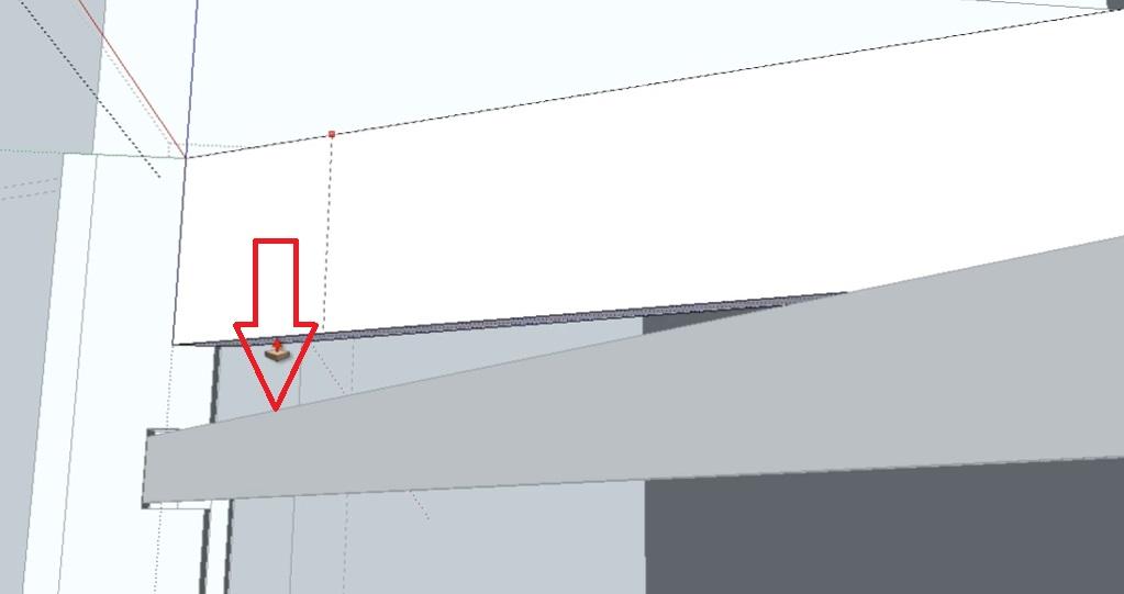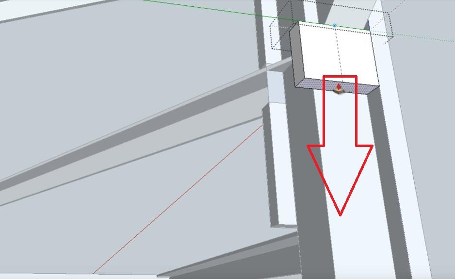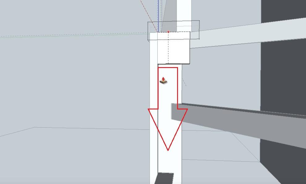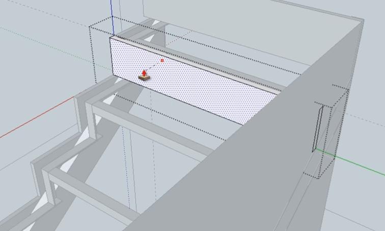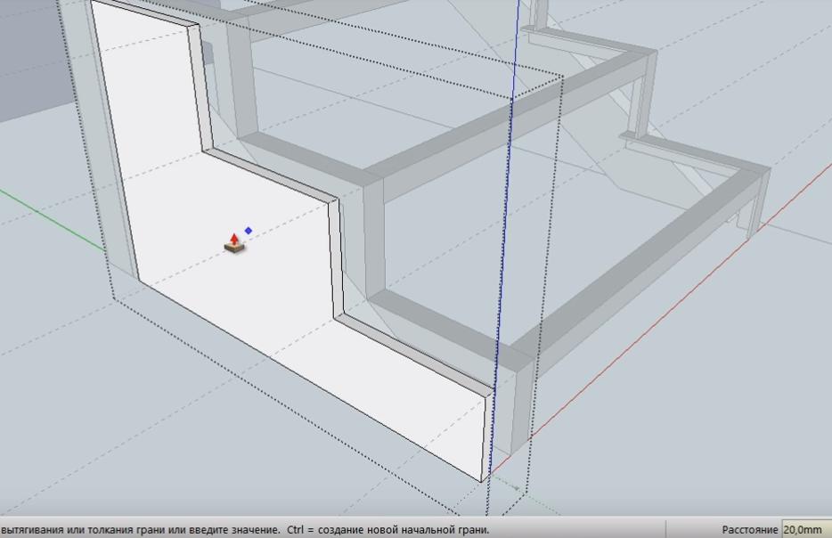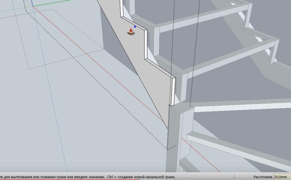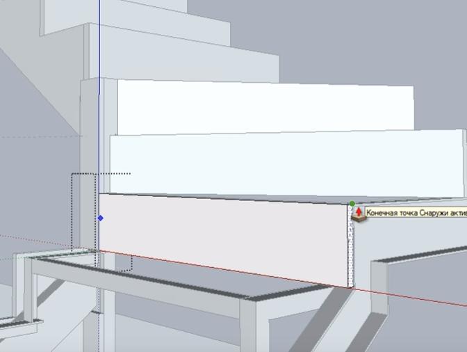Выделяем проекцию облицовочной доски как группу и при помощи инструмента Push+Pull опускаем до перемычки третьей забежной ступени.
