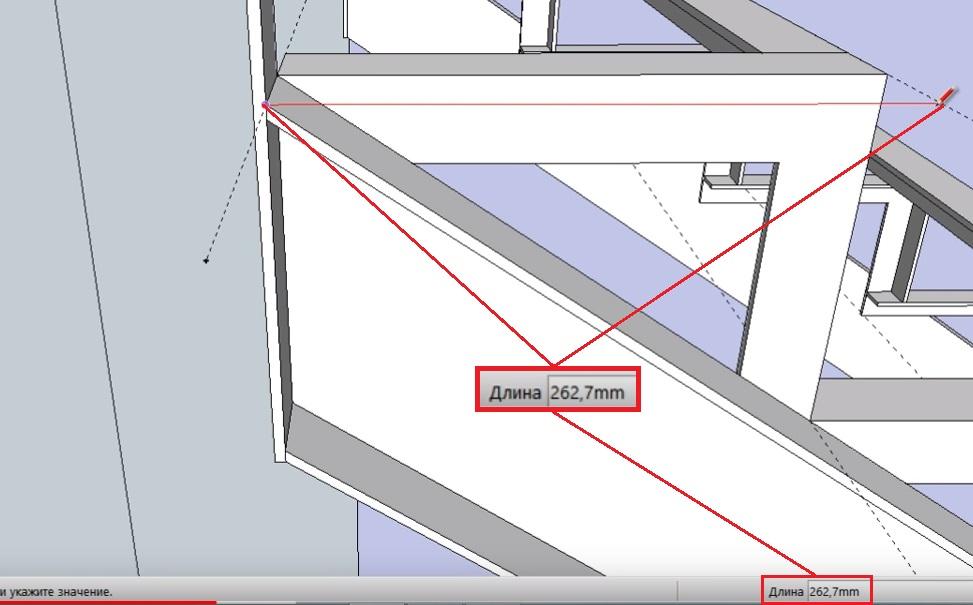 Проводим линию от верхней точки крепления швеллера к перекрытию второго этажа до первой направляющей. Линия должна окрашиваться в красный цвет, т.е. идти строго параллельно швеллеру и стене, а ее длина - соответствовать длине проступи - 262,7 мм.