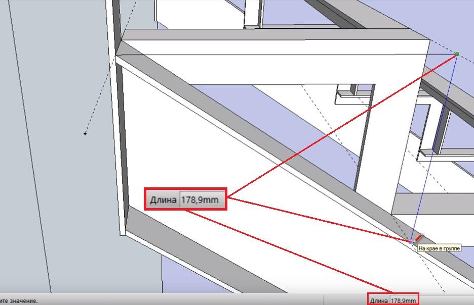 Ведем линию дальше до следующей направляющей. Теперь она должн окрашиваться в синий цвет вертикальной оси и соответствовать по длине высоте подступенника - 178,9 мм.