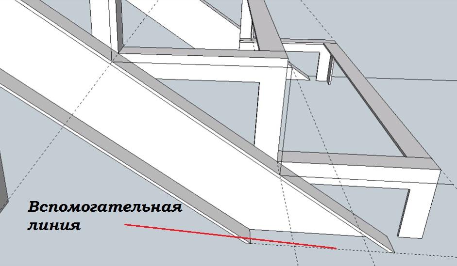 Продолжаем прочерчивать до самого низа. Чтобы прочертить нижнюю часть облицовочной доски проводим еще одну вспомогательную линию, продолжающую внешнюю сторону косоура.