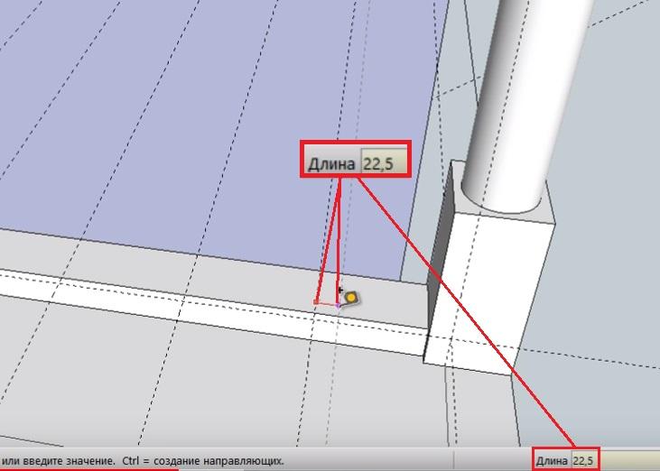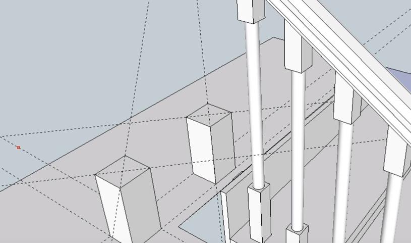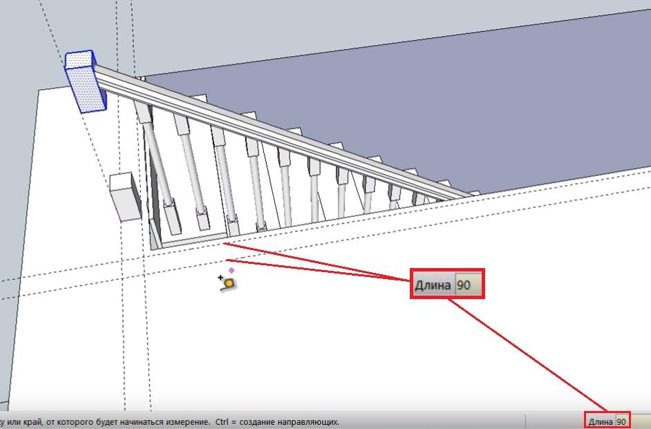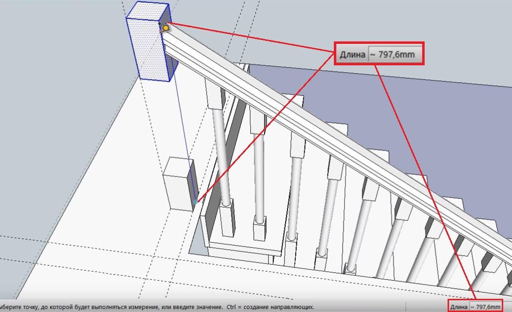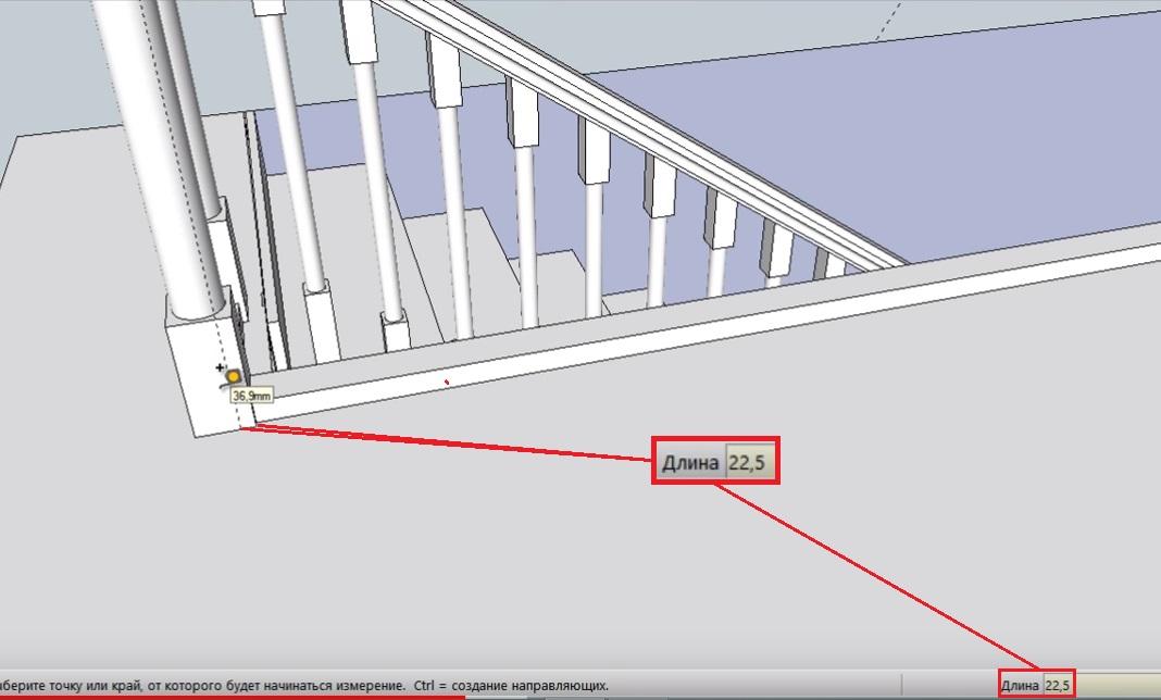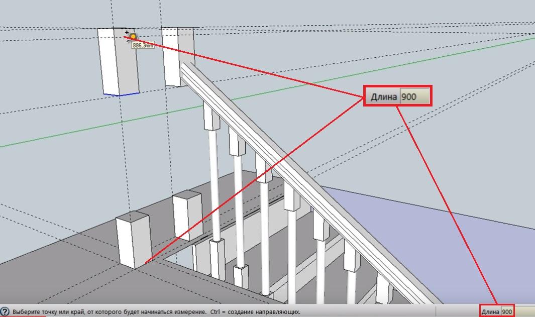 Начинаем с того, что находим место, где будет размещаться второй столб. Для этого проводим вспомогательные линии. Сперва по двум краям уже установленной балясины.