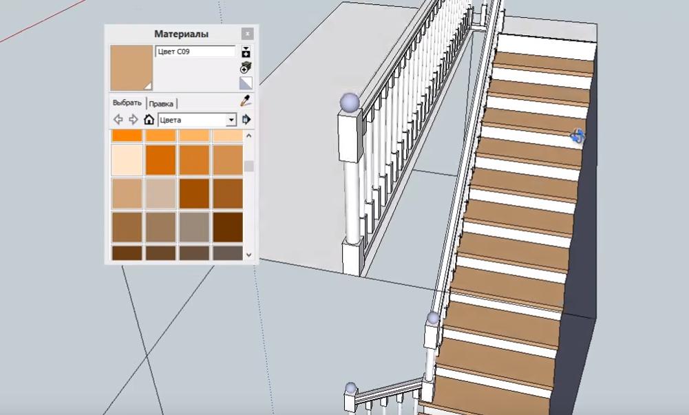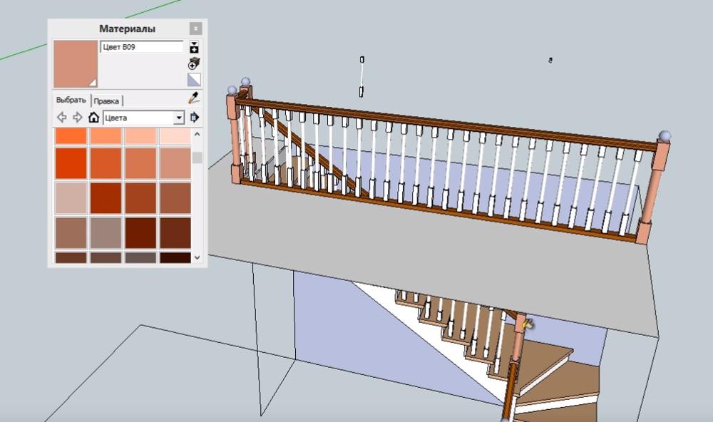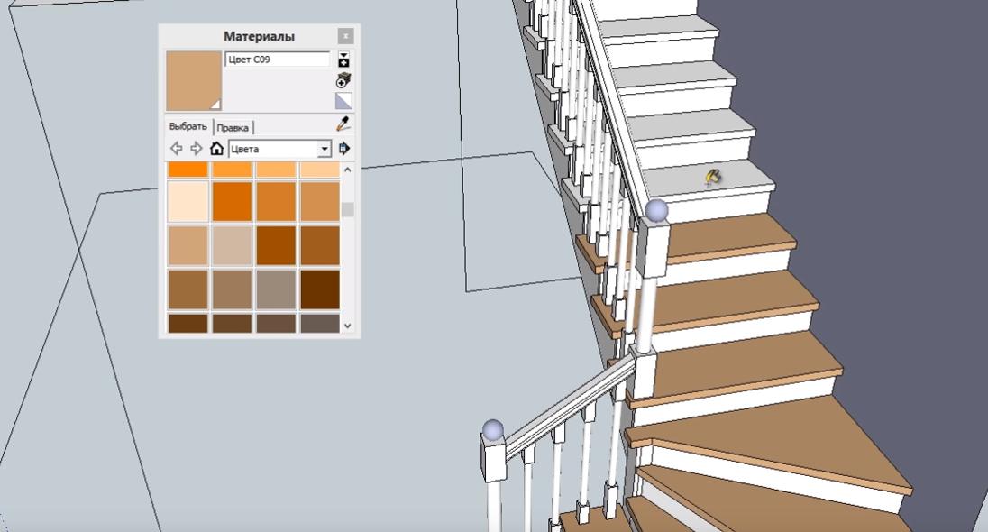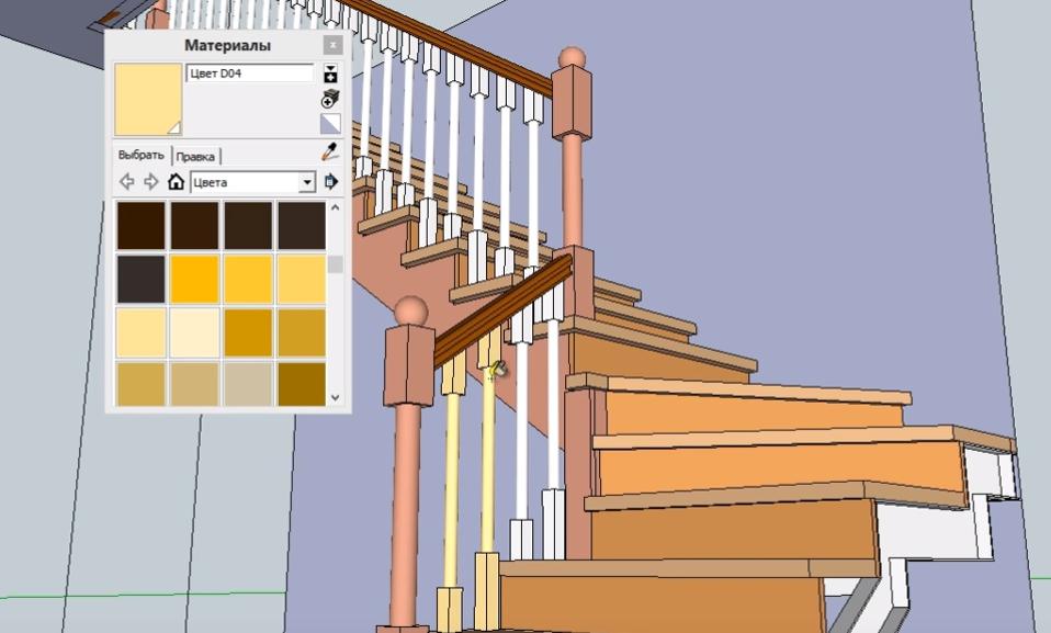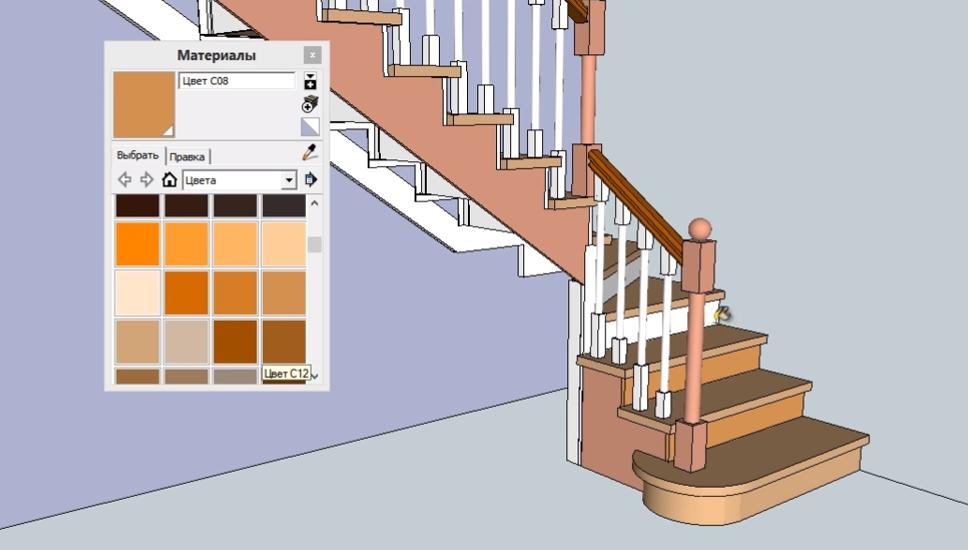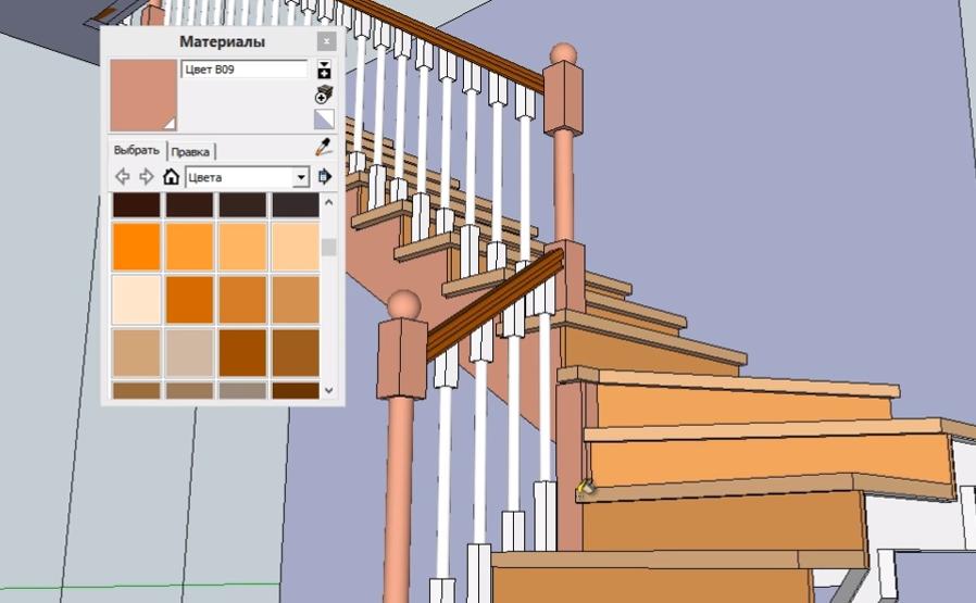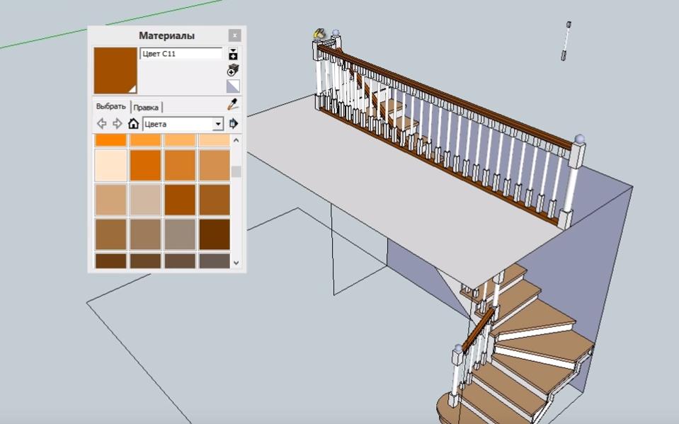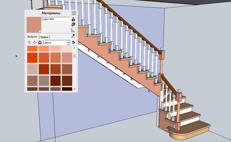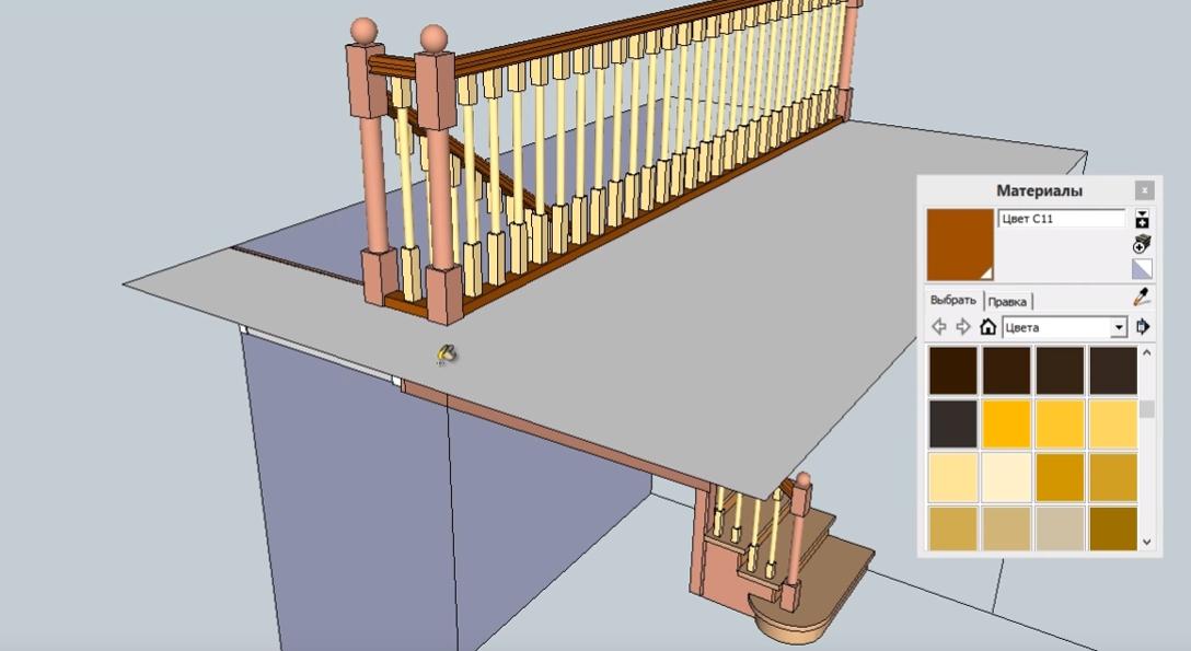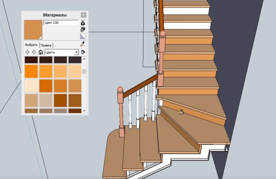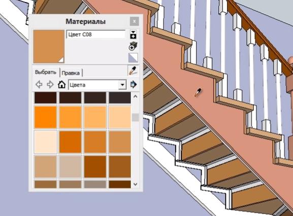 Выбираем из предложенных цветов, тот, которым мы хотим окрасить тот или иной элемент лестницы. К примеру, светло коричневым мы начинаем окрашивать ступени. Левой кнопки мыши кликаем сначала на цвет, а потом последовательно на те элементы, которые мы хотим им покрасить.