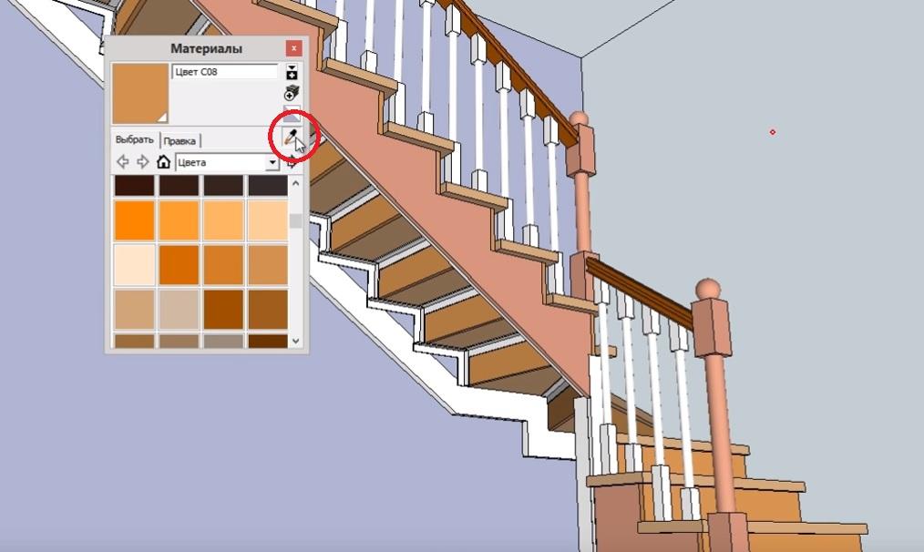 Чтобы раскрасить элементы лестницы в разные цвета, активируем инструмент “Краски”.