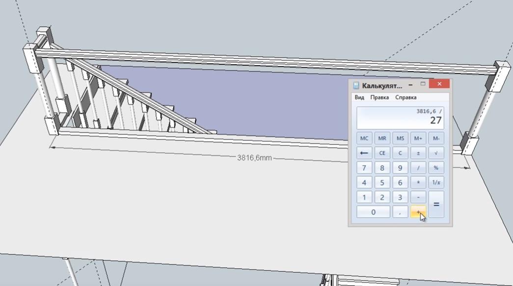 Чтобы расставить балясины по всему расстоянию балюстрады, увеличиваем расчетное расстояние подступенного бруса на 22,5 мм (половина толщины балясины) с каждой стороны.