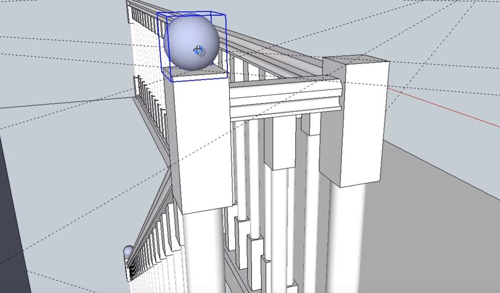 Копируем нарисованный шар и устанавливаем его по центру нижнего опорного столба лестницы (центр столба определяем при помощи двух диагональных вспомогательных линий).