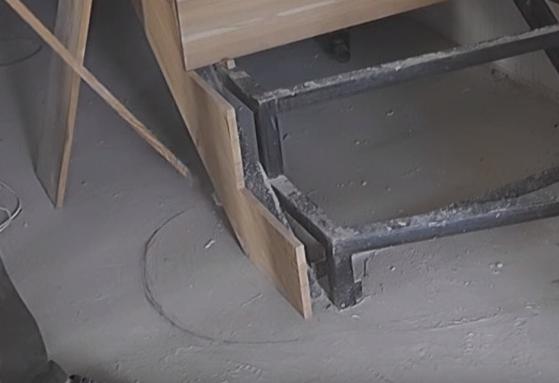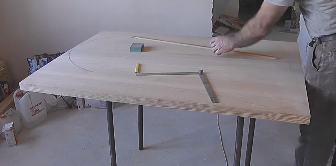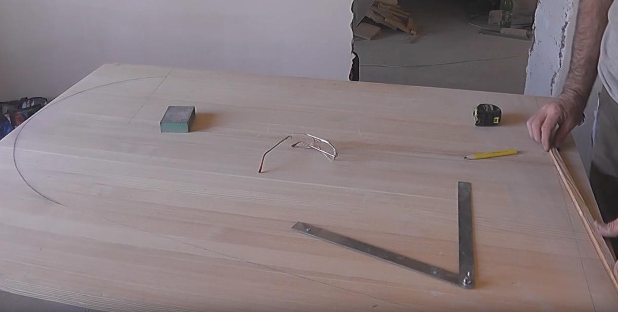 Приступаем к изготовлению первых забежных ступеней. Профиль первой пригласительной ступени рисуем прямо на полу.