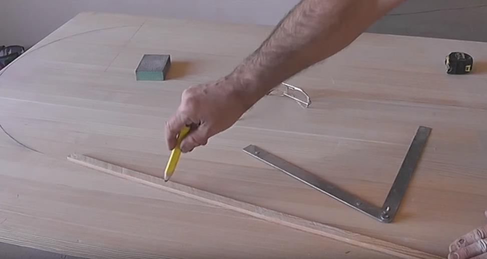 После этого сделанный на полу профиль будущей ступени при помощи угломера и рулетки переносим на щит.