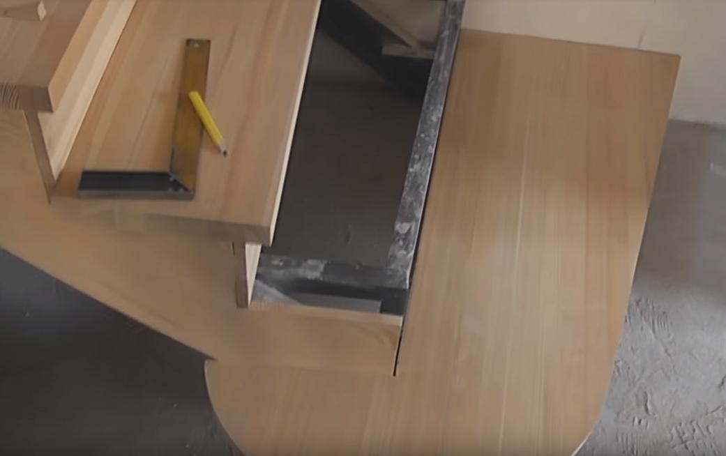 Теперь с обратной стороны ступени необходимо сделать паз, в который будет вставляться фанерный подступенник. Для этого используем следующее приспособление: