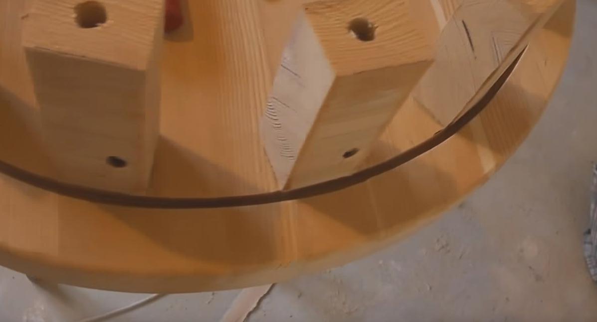 После этого вырезаем из обычного листа фанеры полосу. Лист толщиной 4 мм оказался достаточно твердым и его пришлось замачивать, чтобы согнуть.