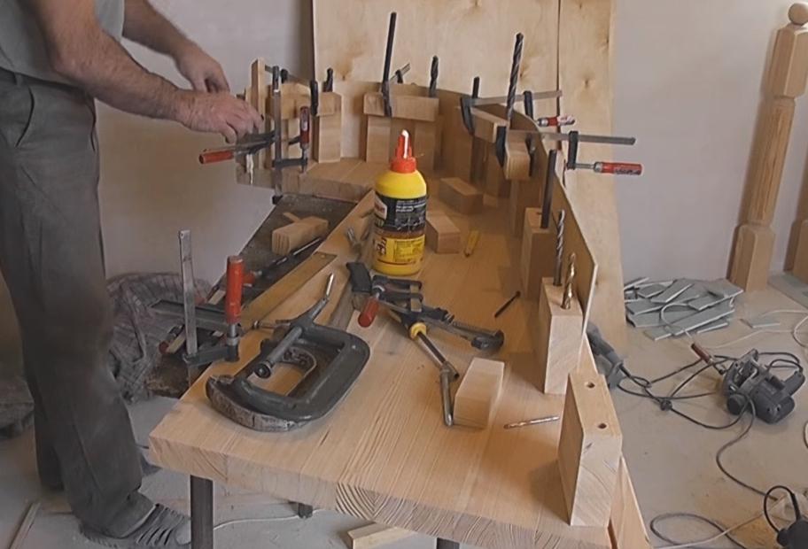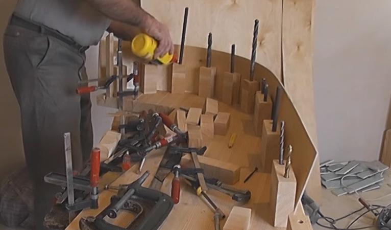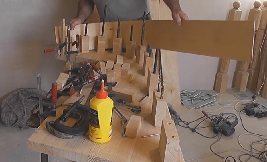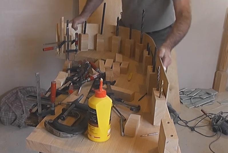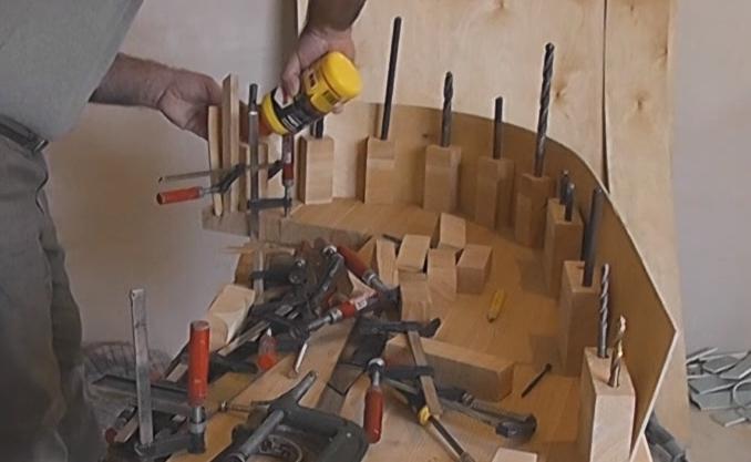 Для этого я обработал ее из пульвелизатора водой и подождал около 15 минут, чтобы дерево пропиталось влагой. После этого я начал ее сгибать под форму ступени и аккуратно вставлять в паз.