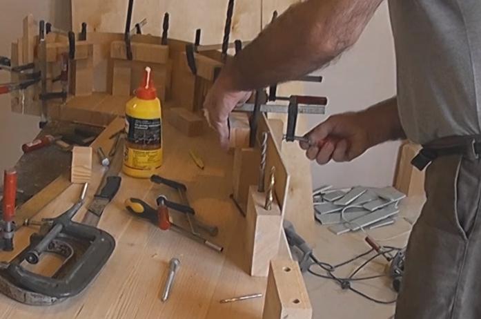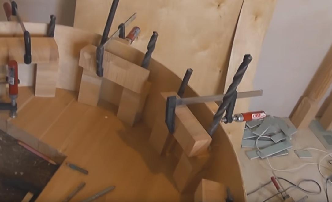Фанерный лист прижимаем к стойкам струбцинами. С внешней стороны фанерного листа подкладываем дощечки, чтобы не оставить следов от струбцин.