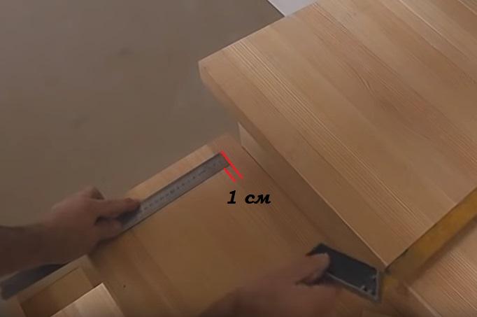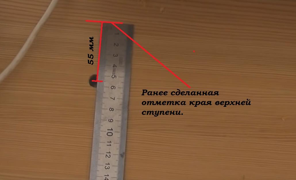 Отмечаем место окончания свеса верхней ступени и откладываем от этой точки 1 см.