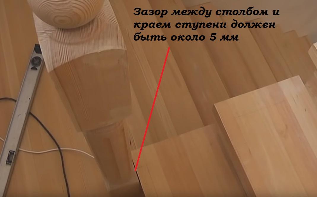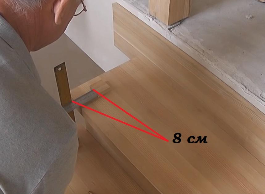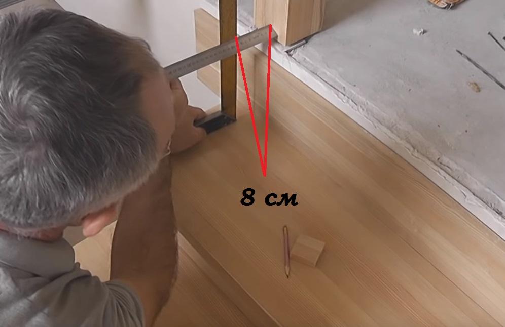Замеряем расстояние от крайней балясины на верхней ступени до столба - оно получается 8 см.