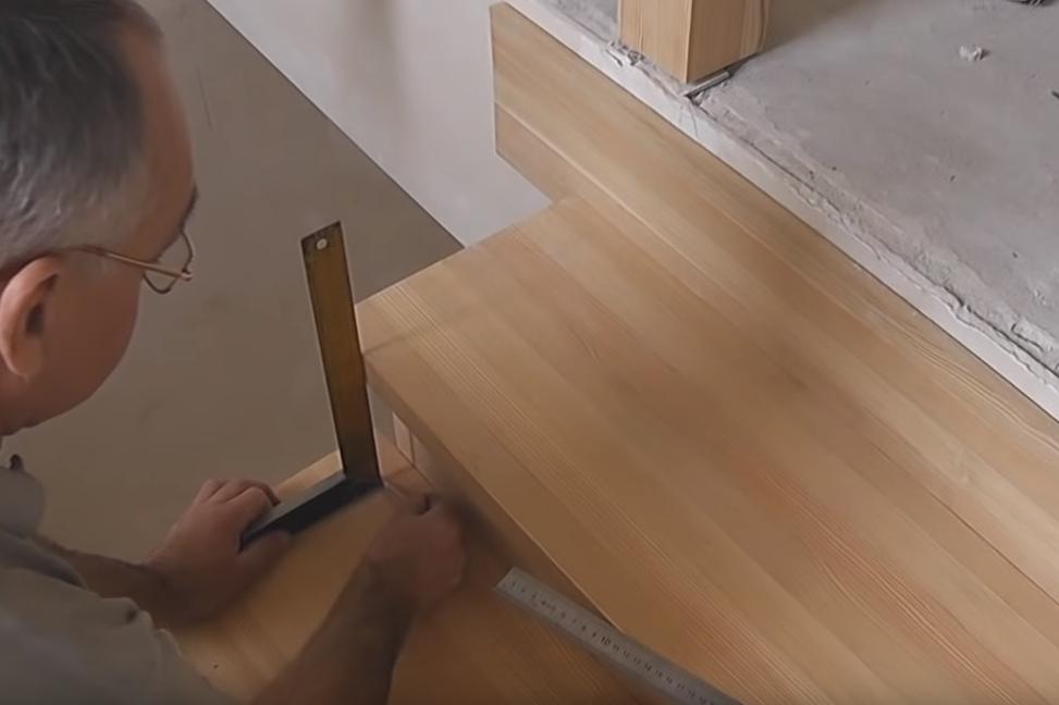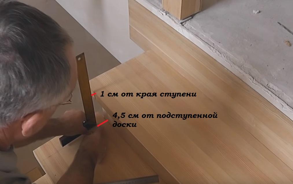 Те же самые 4,5 см откладываем от каждой подступенной доски на каждой ступени.