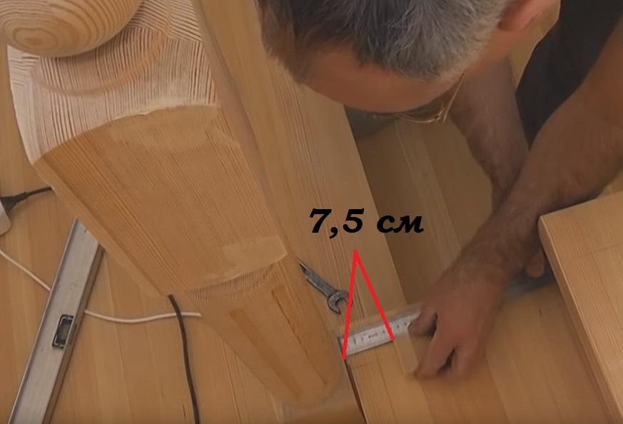 С учетом того, что зазор между столбом на площадке и ступенью у нас 0,5 см, расстояние до балясины там будет чуть меньше - 7,5 см.