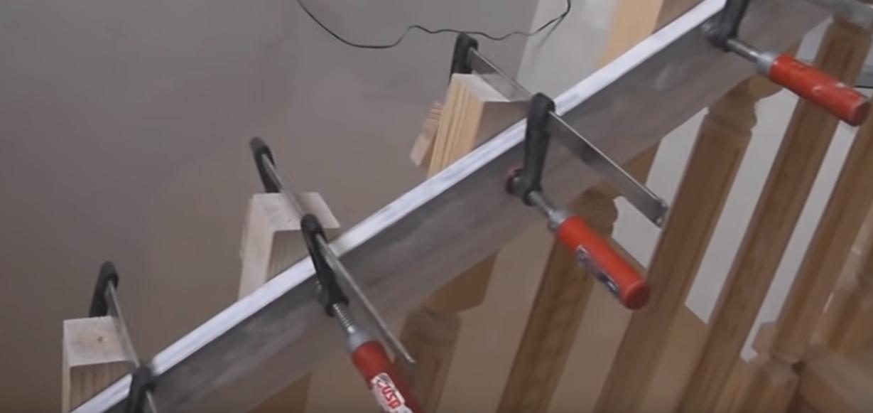 При помощи направляющей и струбцин закрепляем и связываем между собой все установленные балясины. Выверяем их положение при помощи уровня и соотносим с положением столбов.