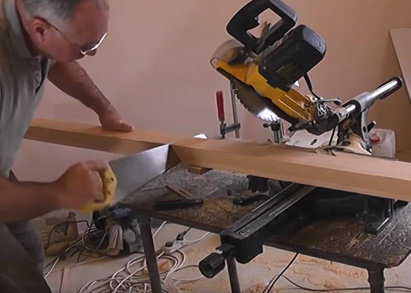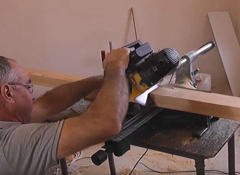 В соответствии с этим настраиваем и угол наклона циркулярной пилы, которой будем обрезать поручень лестницы.
