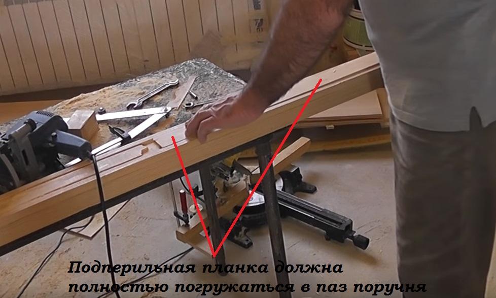 Еще один момент необходимо отметить. Перилина изначально представляет собой обычный брус и нам нужно с обратной стороны сделать паз под подперильную планку.