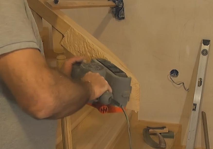 Теперь берем ленточную шлифовальную машинку и выравниваем бока поручня.