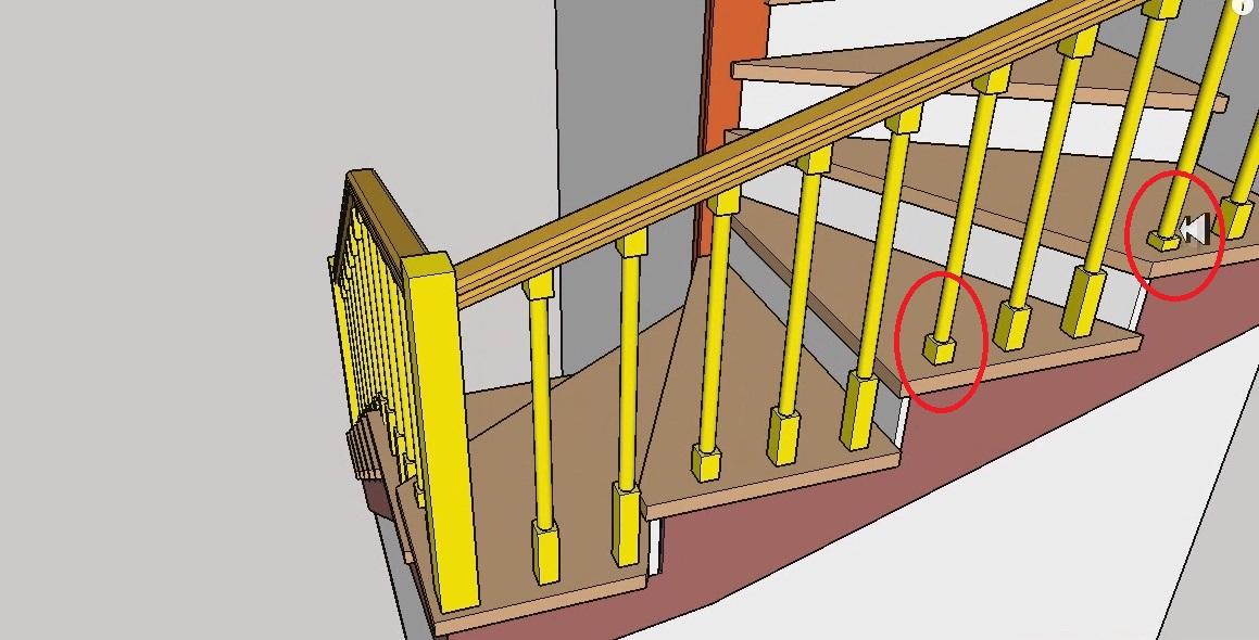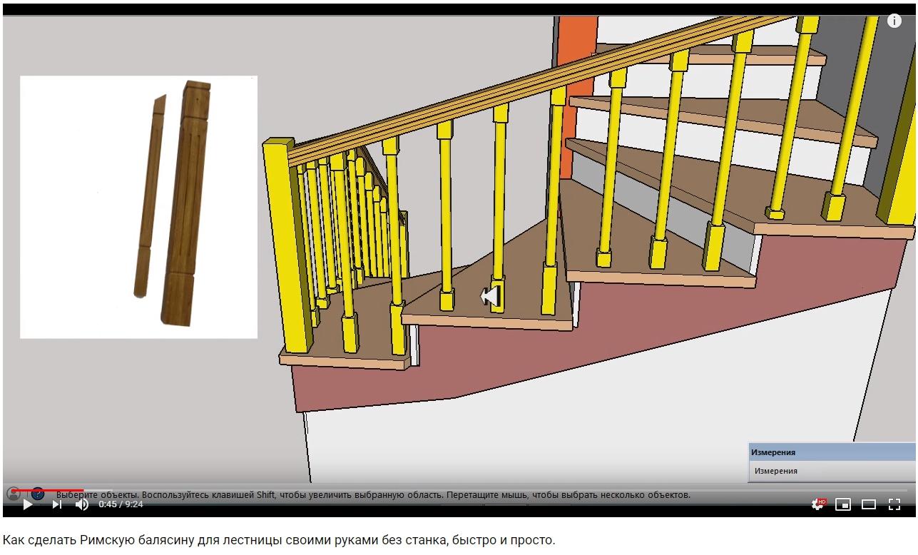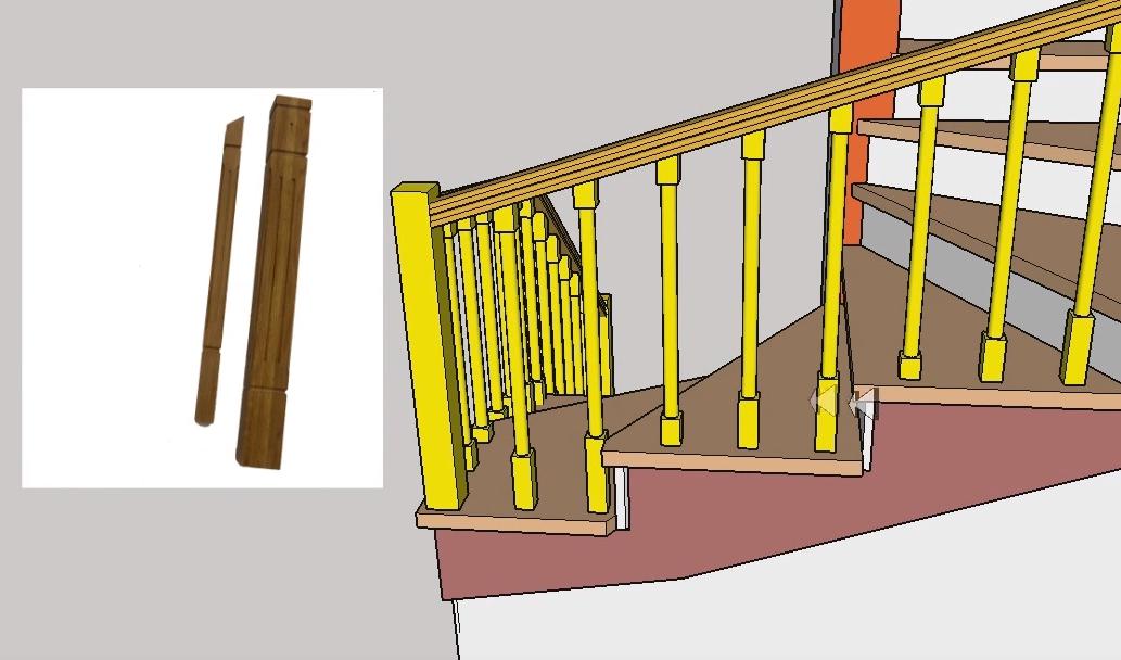 На рисунке выше видно, что на двух разворотных ступенях нижние цоколи срезаются почти полностью и в данном случае имеет смысл либо увеличить высоту нижнего цоколя вместе с высотой всей балясины, либо за счет уменьшения средней резной части. Но самостоятельно сделать резную фигурную балясину достаточно сложно. Гораздо проще изготовить римскую балясину и такие же римские столбы.