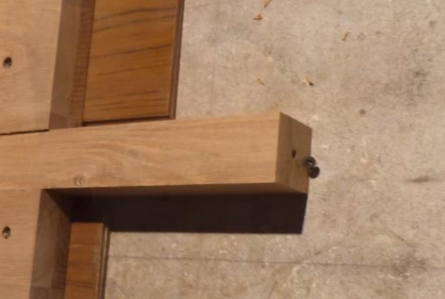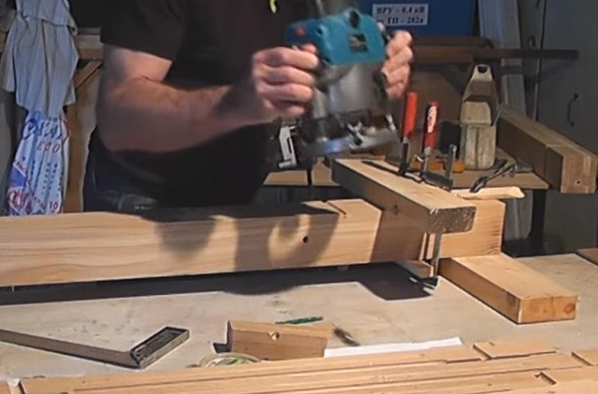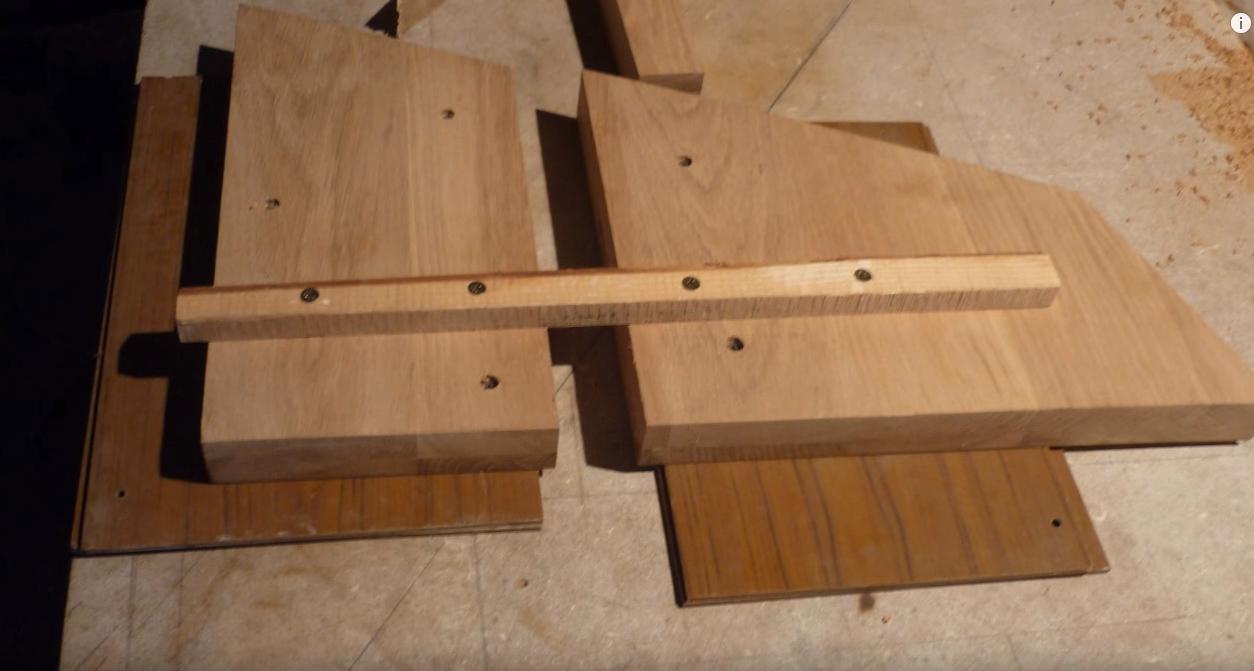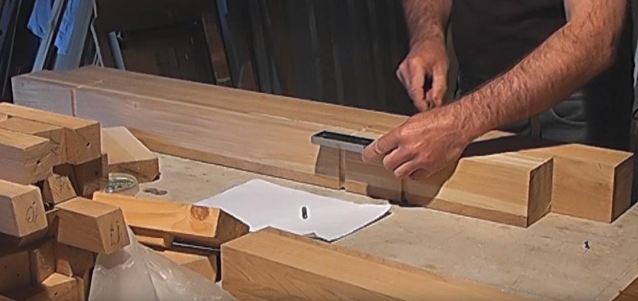 Для фиксации брусков-заготовок под балясины используем две доски, оставшиеся после обрезки ступеней толщиной 40 мм, соединяем их между собой рейкой и подкладываем под них доски, чтобы они были чуть выше, чем брус балясины 45 х 45 мм.