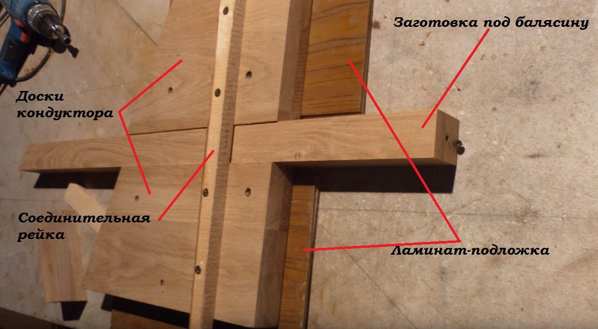 Зазор между скрепляющей доски кондуктора рейкой и заготовкой под балясину должен быть 3-5 мм, чтобы под него заходил закрепляющий клин.