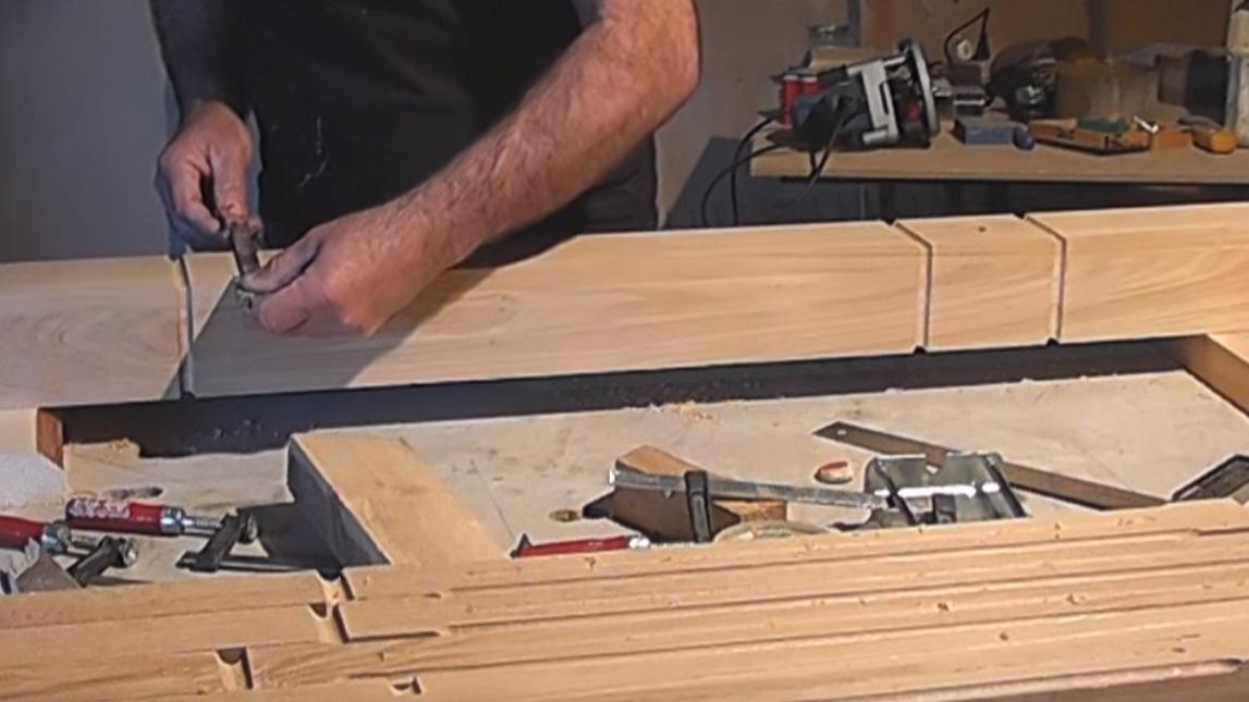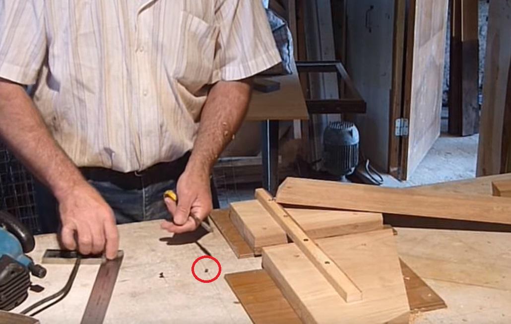 Для точной фиксации балясины используем саморез - вкручиваем его в поверхность верстака.