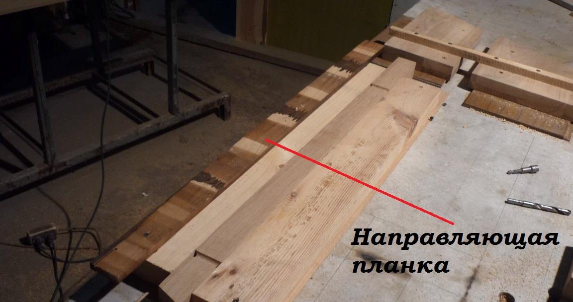 Продольные вырезы начинаем делать ровно по центру с каждой из четырех сторон балясины. Для этого зажимаем их длинными досками и на одну из них устанавливаем направляющую планку.