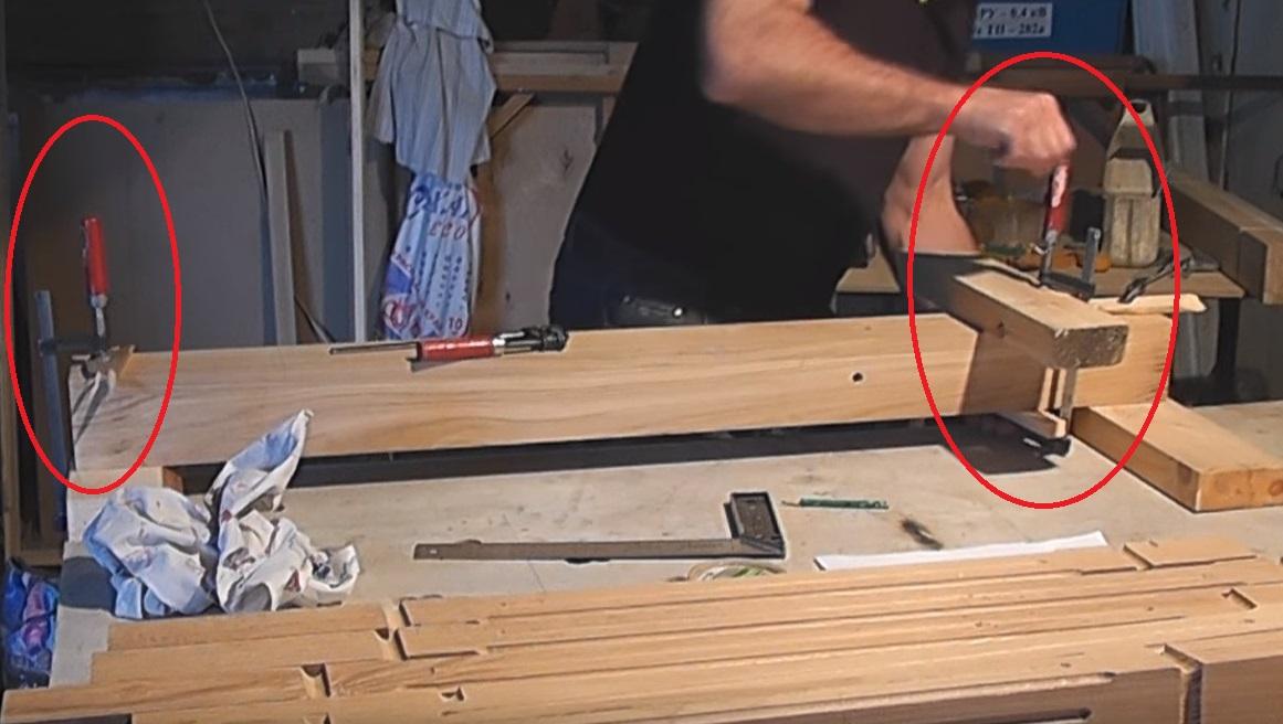 В качестве направляющих для поперечных вырезов используем любые имеющиеся обрезки досок. Крепим их струбцинами непосредственно на столб.