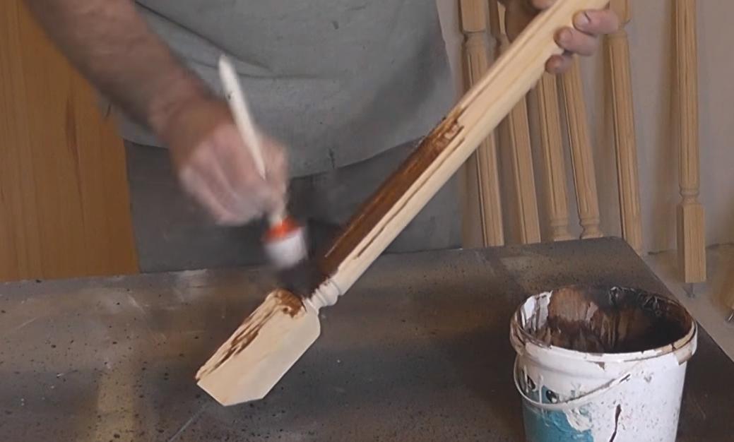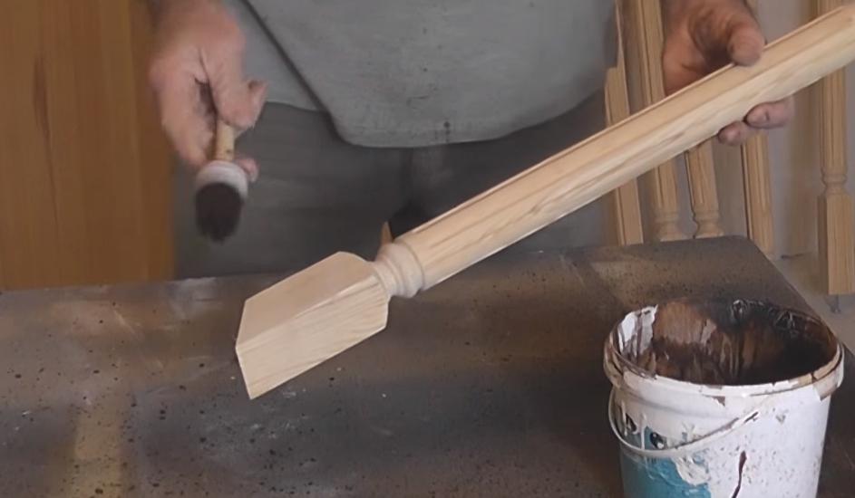 Для равномерности промазываем вдоль балясины длинными мазками, обращаем внимание на то, чтобы были прокрашены пазы и чтобы нигде не оставалось темных пятен.