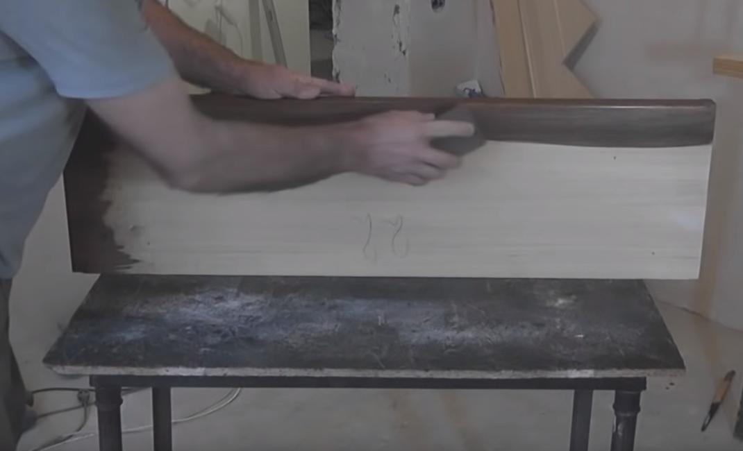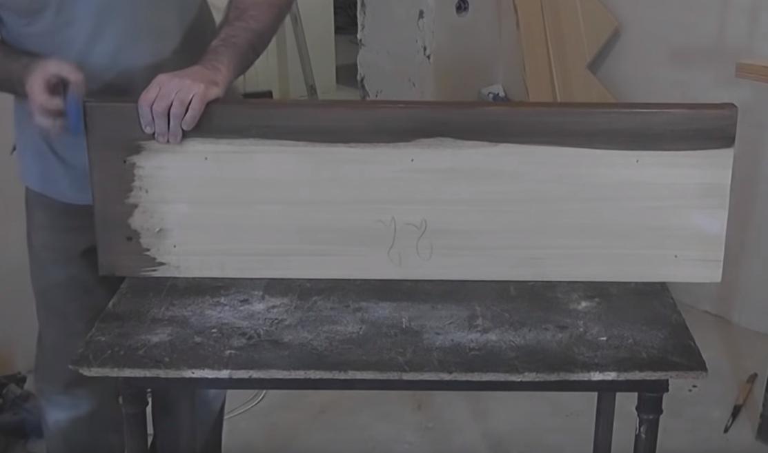 Начинаем с подступенника, наносим широкими мазками вдоль волокон древесины. Сначала с одной стороны, потом с другой и по краям.