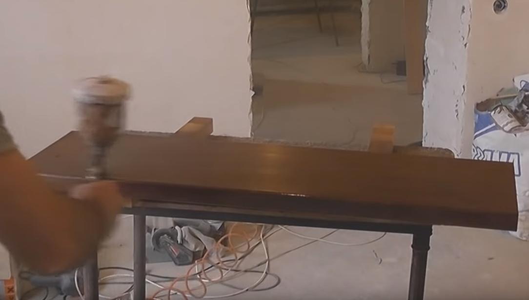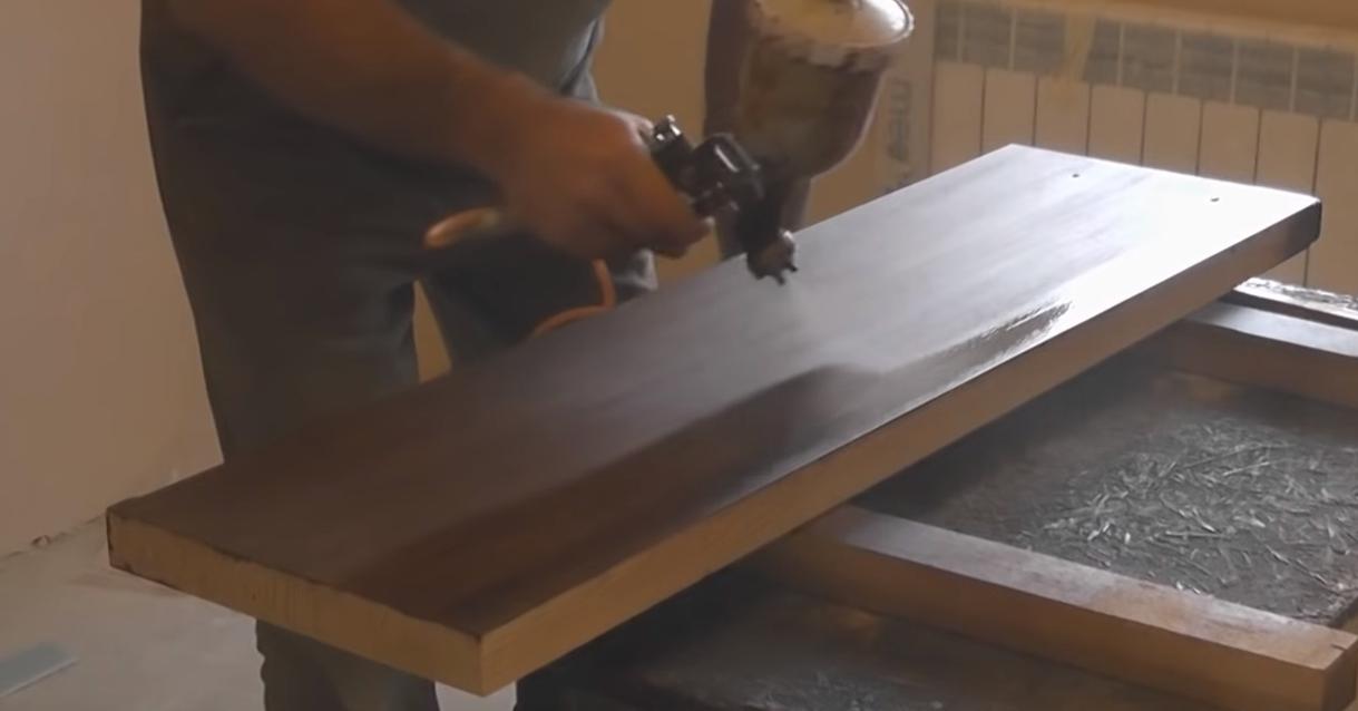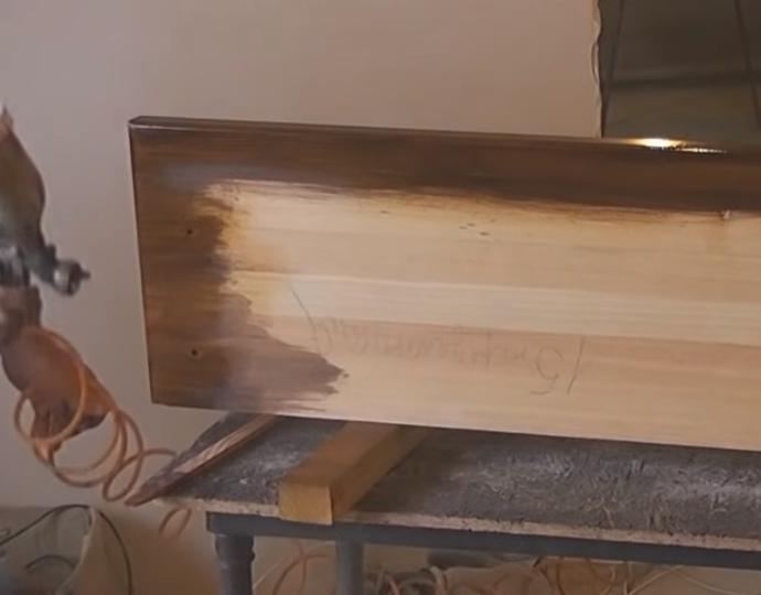 Добавленный в лак колер поможет дополнительно выровнять цвет после покраски морилкой. Для нанесения лака используем пневматический краскопульт.