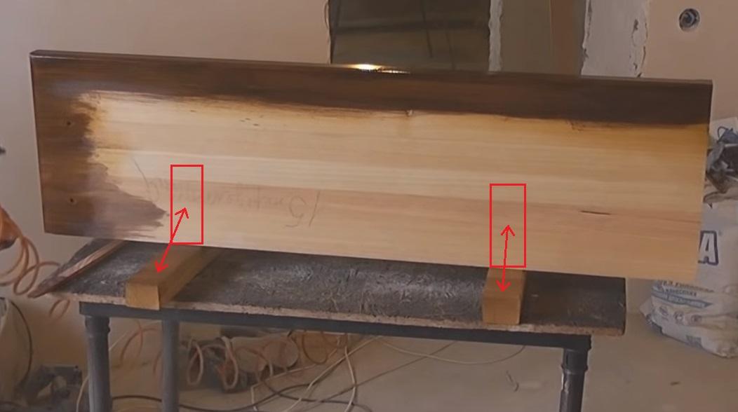 Ступень у нас стоит на двух брусках, для окрашивания торцов и лицевой стороны кладем ее так, чтобы не затронуть покрытые лаком края.