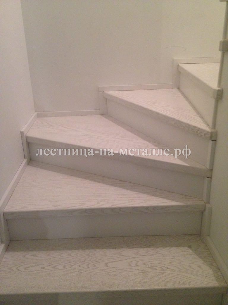 Лестница с тремя забежными ступенями, обшитая ясенем. Лестница с тремя забежными ступенями.