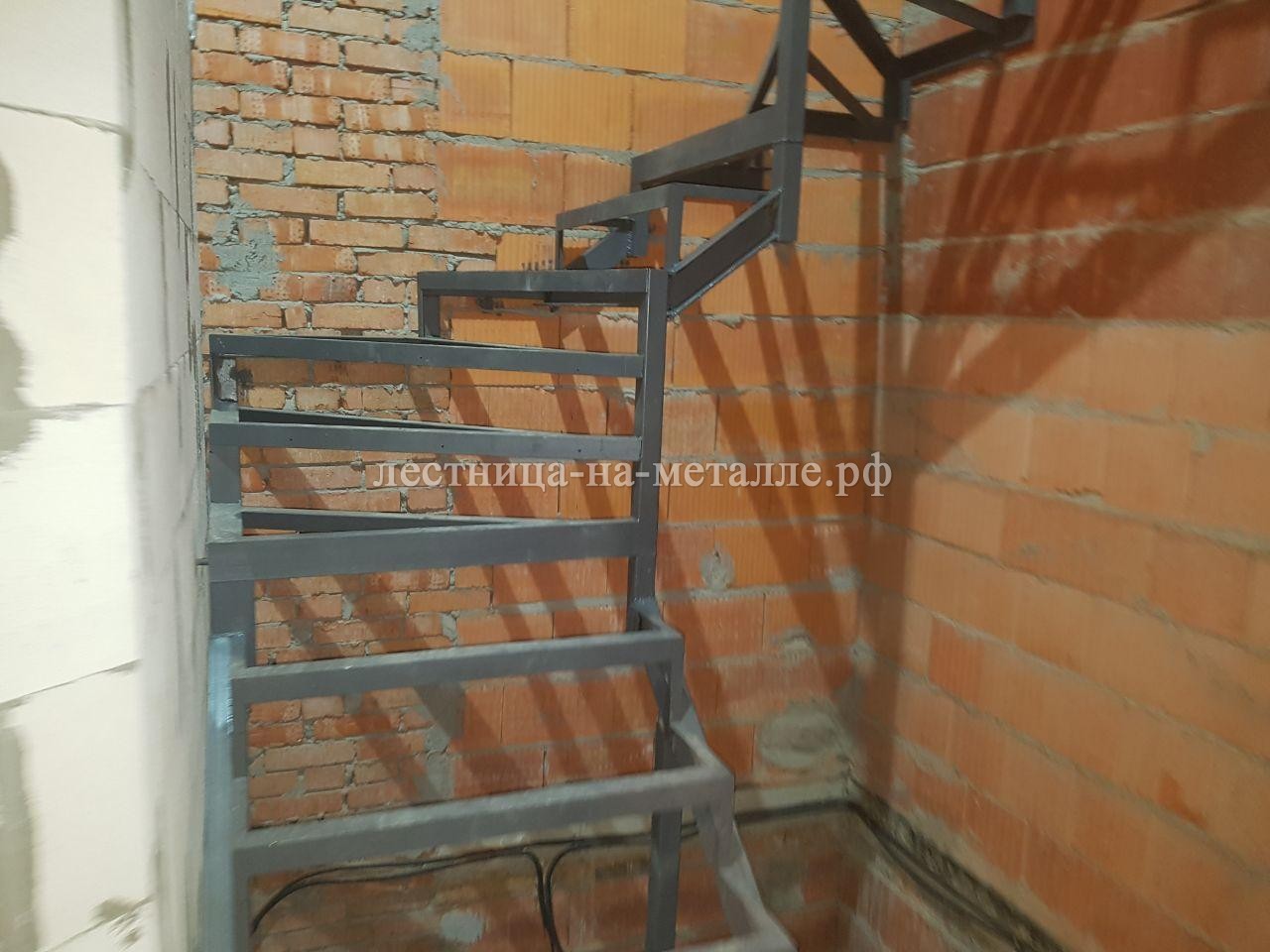 Металлический каркас лестницы открытого типа с шестью забежными ступенями. |